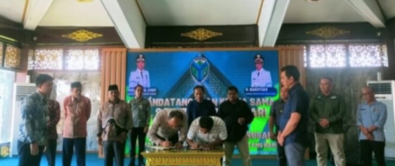 GalaxyNews.Co.Id.Batanghari/Jambi.-Bersama jajarannya, Bupati Batanghari Muhammad Fadhil Arief menyaksikan penandatanganan kerjasama (MoU) PT Sawit Jambi Lestari ( SJL ) dengan Koperasi Tangguh Abadi Terusan Kecamatan Maro sebo Ilir (MSI), di Ruang Kaca Rumah Dinas Bupati, Kamis (10/8/2023).